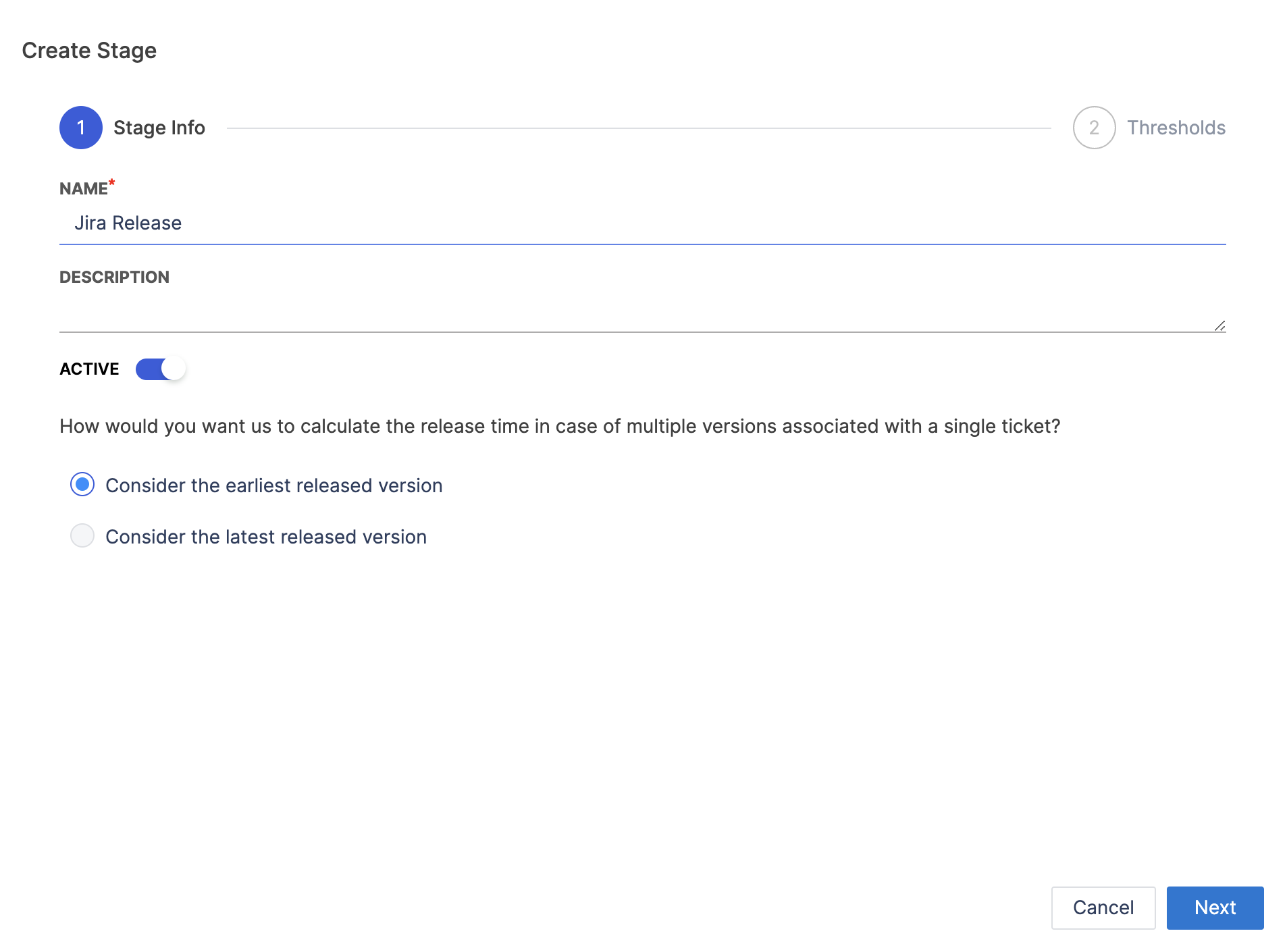 When a ticket is associated with multiple versions, the Jira release stage provides two calculation methods to reflect the appropriate lead time: