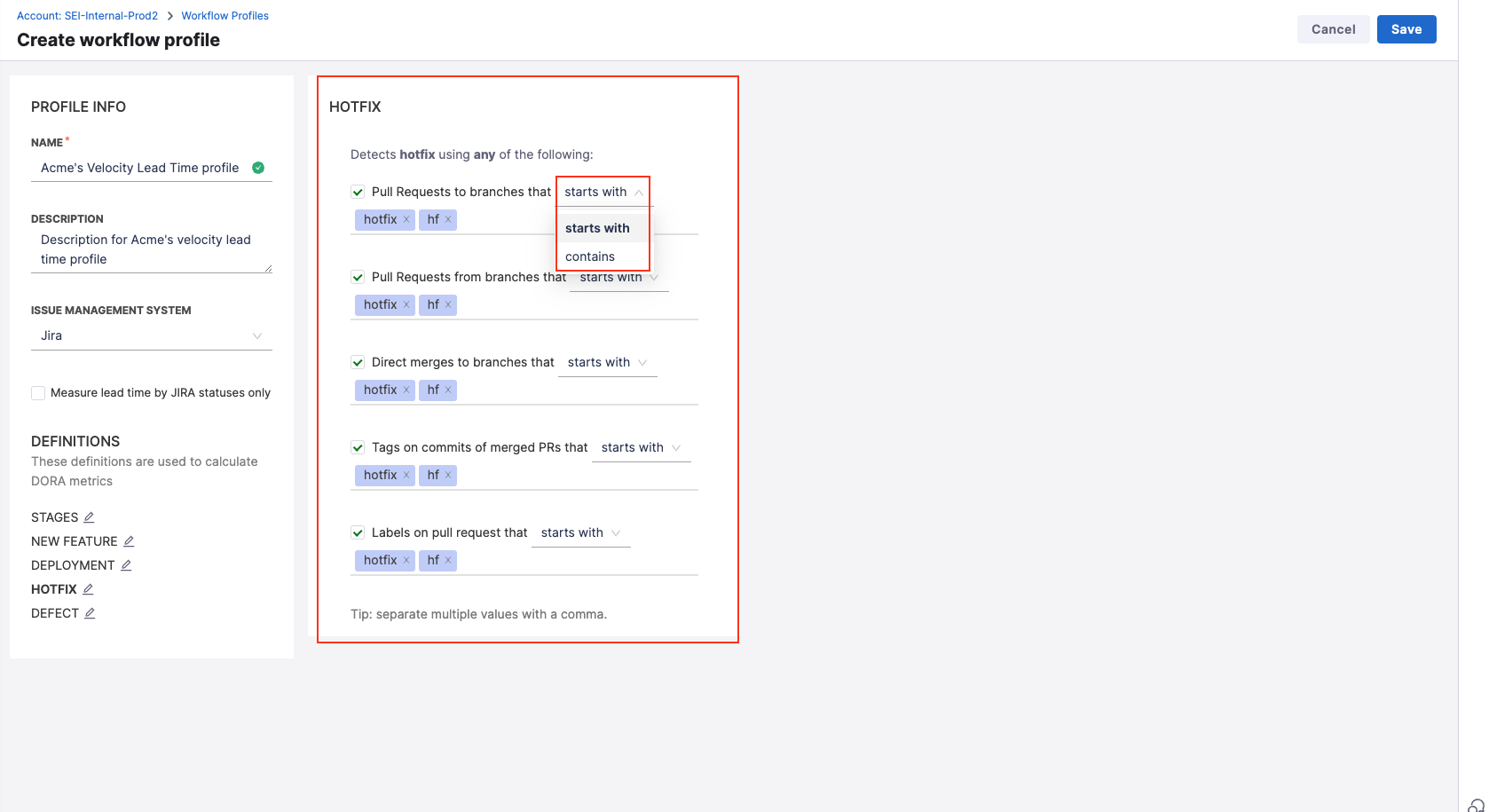 You can customize Workflow profile stages and thresholds to align with your team's Software Development Lifecycle (SDLC) processes. For profiles involving multiple tools like issue management, SCM, and CI/CD, avoid duplicate tracking of the same event (e.g., Deploy to Production in both Jira and CI/CD).