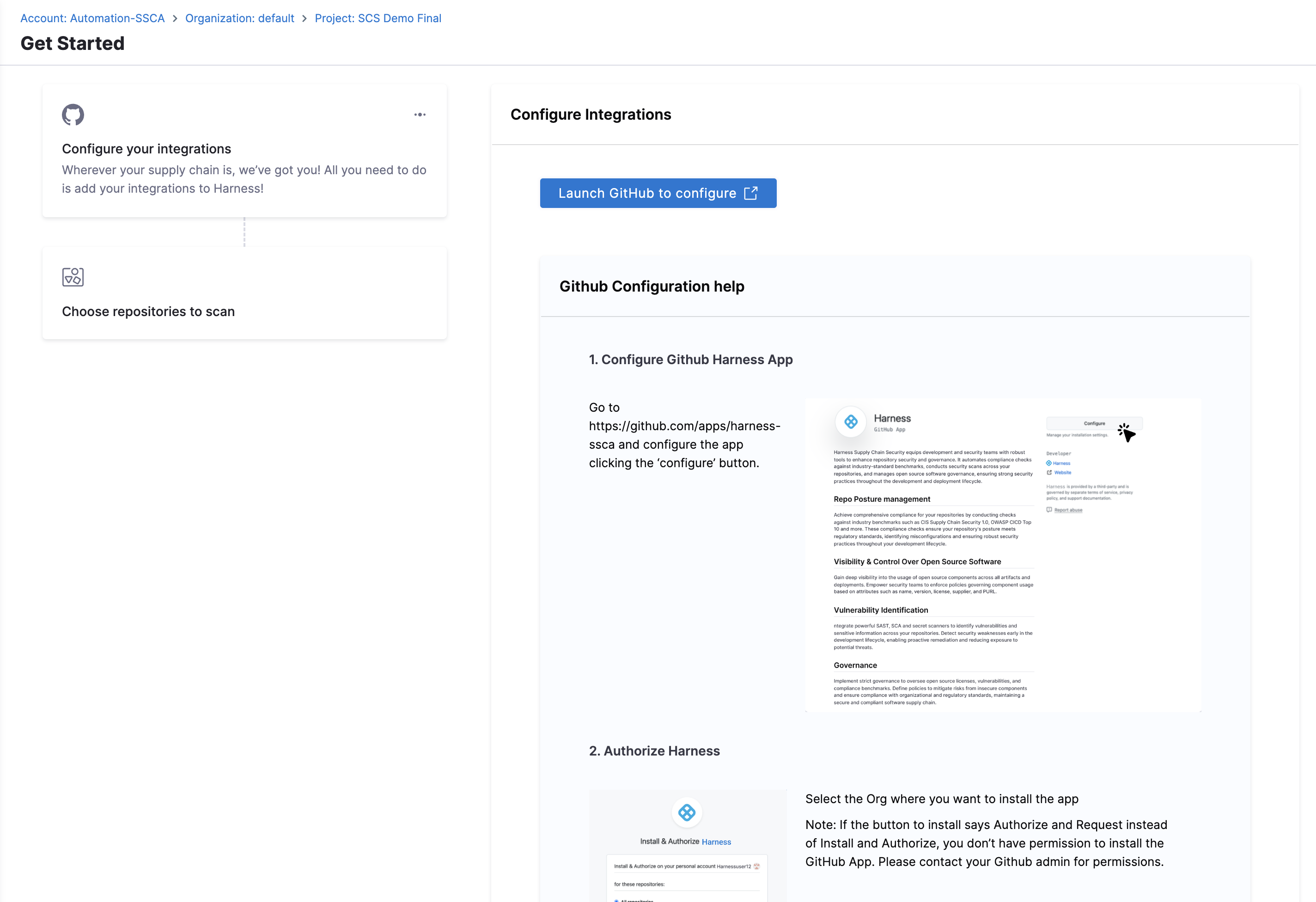 Configuring the Harness-SCS app allows SCS to connect with your GitHub and fetch necessary information.