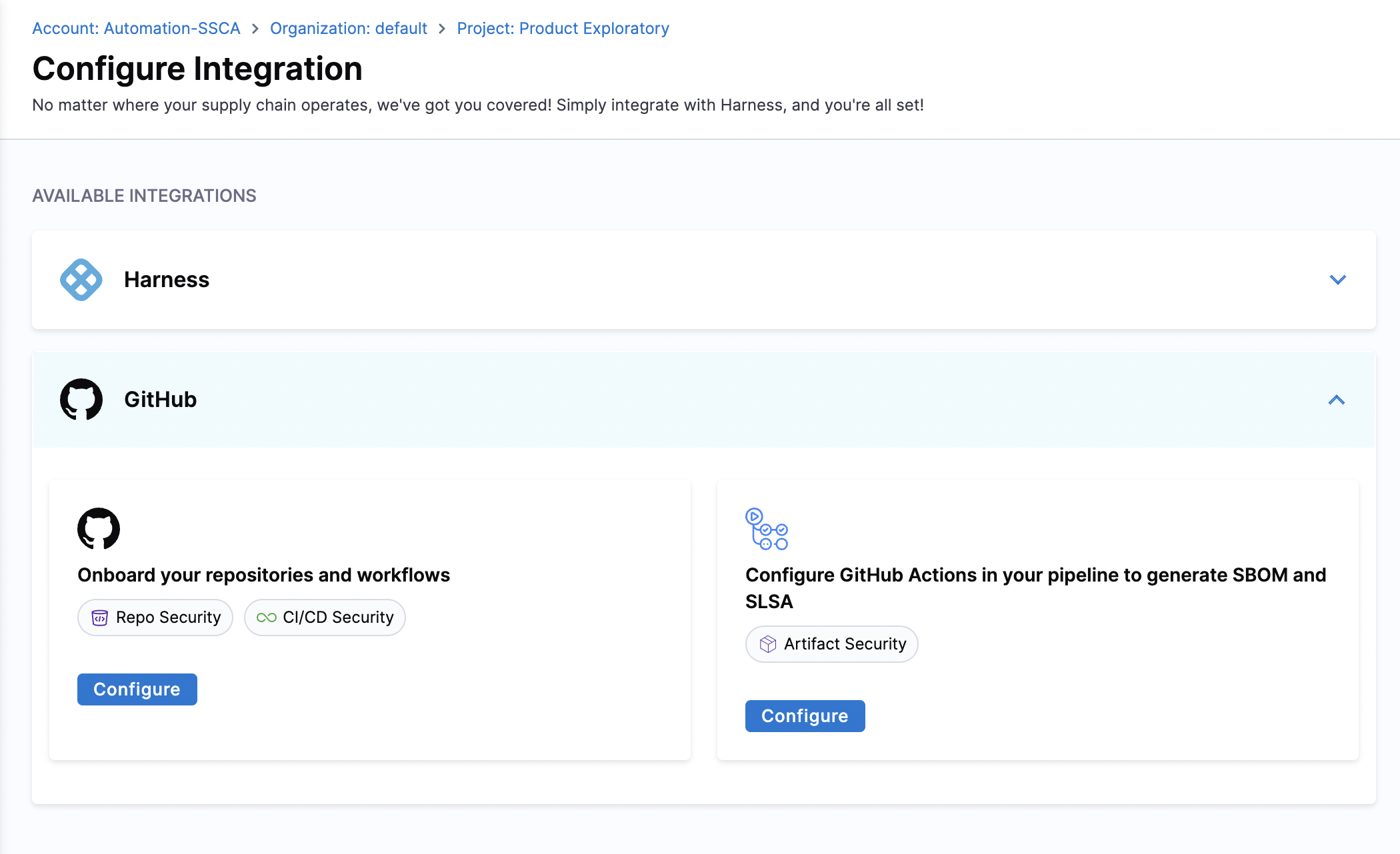 You can select Configure in the Repo Security and CI/CD Security option. This will take you to a new screen with two steps: configuring your integration and selecting the repositories to scan.